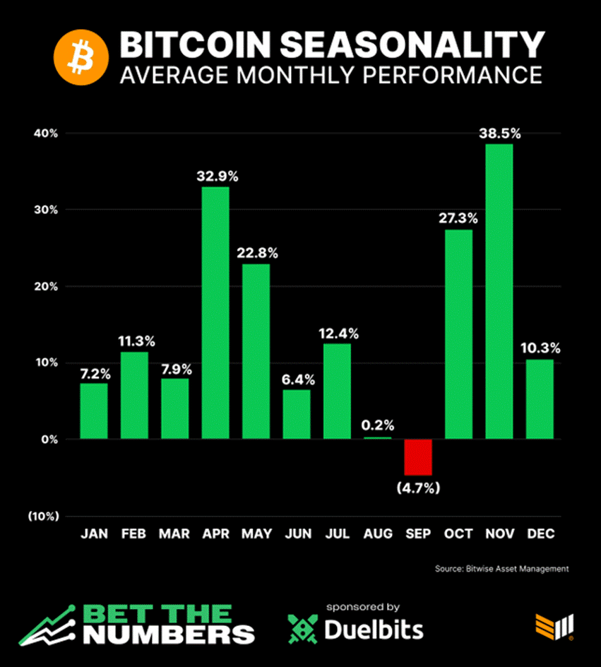 Históricamente, el Bitcoin rinde por debajo en septiembre, pero luego se dispara en octubre, noviembre y diciembre. (ver imagen)